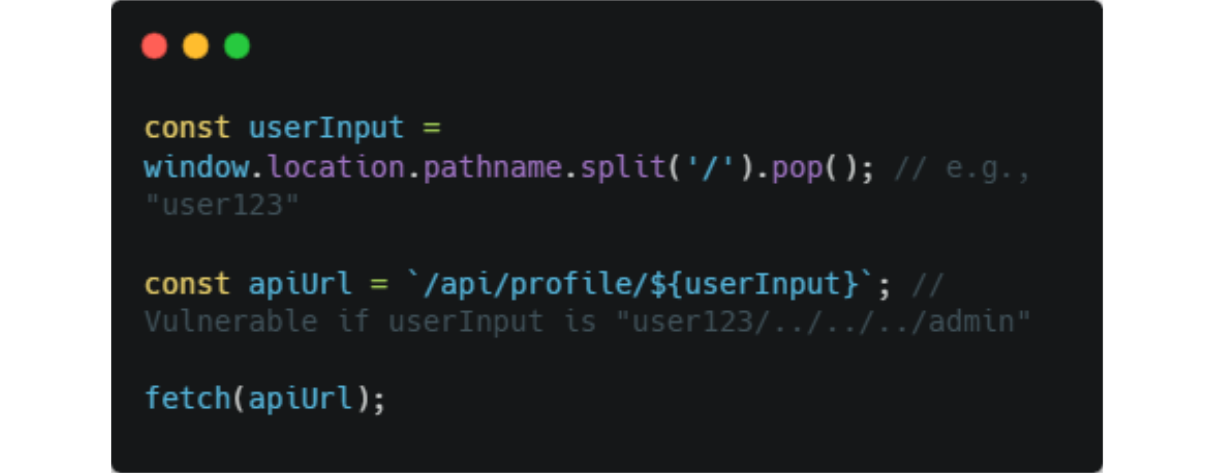 Here, injecting user123/../../../admin resolves to /api/admin, bypassing intended routes.