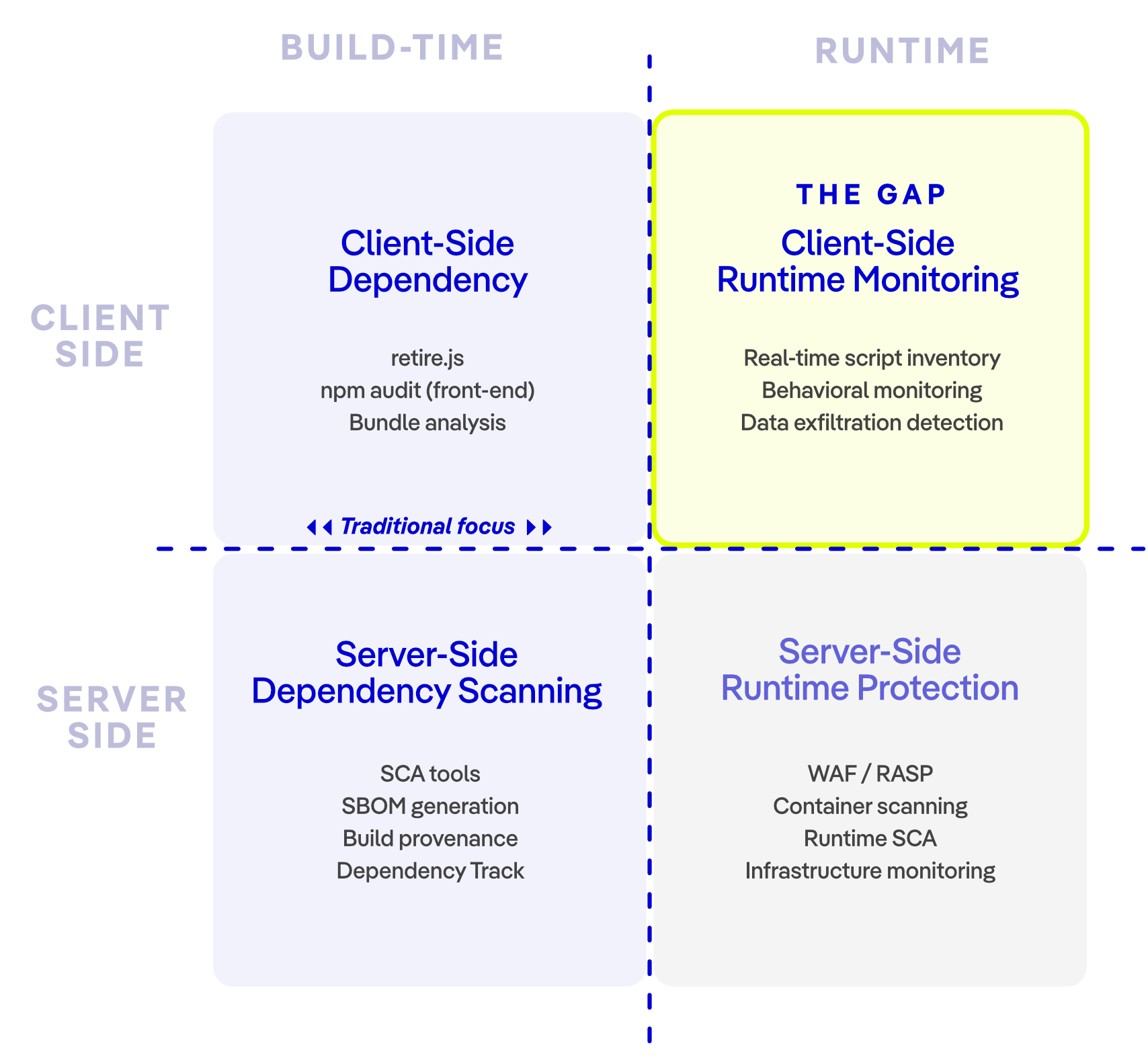 Think about supply chain security along two dimensions: when you check (build-time versus runtime) and where the code runs (server-side versus client-side). Most organizations have invested heavily in the build-time column — SCA tools, SBOM generation, dependency scanning, and build provenance verification. On the server side, some have extended that into runtime with container scanning, WAF, and RASP. These are mature capabilities that address real risks.