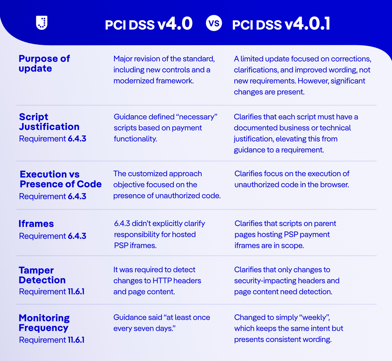 PCI DSS v4.0.1 is a refinement of the original 4.0 release, introduced to clarify intent, remove ambiguity, and help organizations implement the standard more consistently. While no new requirements were added, they were reworded and expanded to address merchant questions and concerns after the initial release. The table below summarizes the key changes between PCI DSS v4.0 and v4.0.1 at a glance.